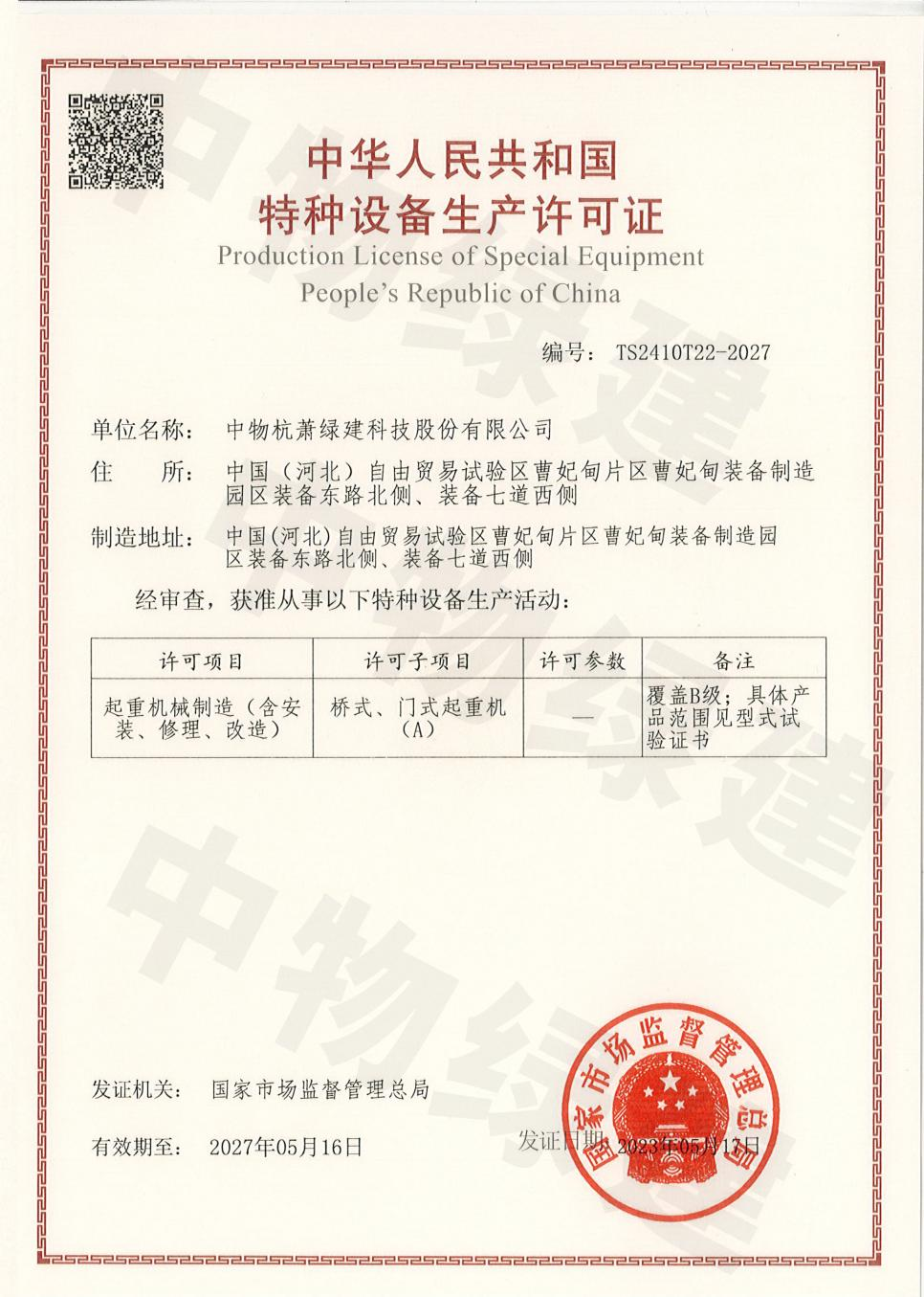 近日,經(jīng)國家市場監(jiān)督管理總局批準(zhǔn),中物綠建獲得特種設(shè)備生產(chǎn)許可證(A級),獲準(zhǔn)從事起重機(jī)械制造(含安裝、修理、改造)特種設(shè)備生產(chǎn)活動(dòng)。A級制造許可證屬于起重機(jī)生產(chǎn)范圍最高級別許可證,持證企業(yè)可生產(chǎn)各類橋式、門式起重機(jī)等設(shè)備。